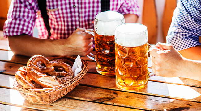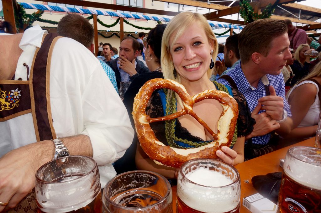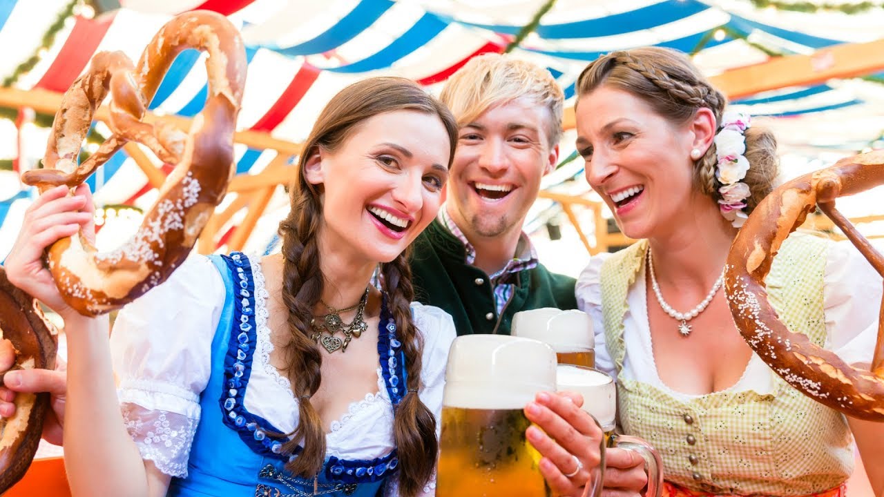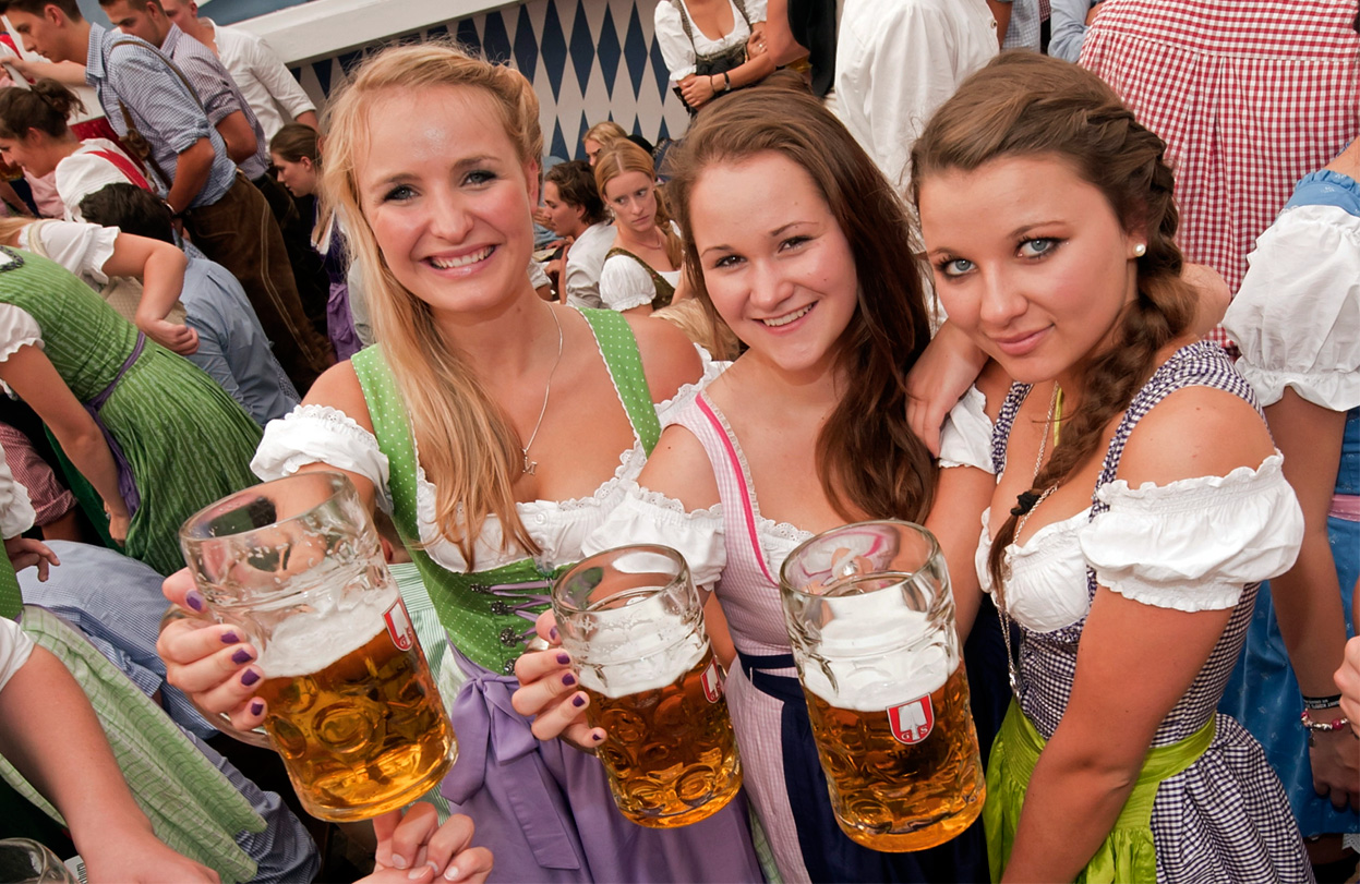 Almost everyone at Oktoberfest wears traditional Bavarian attire; the men wear lederhosen, and the ladies wear dirndls.